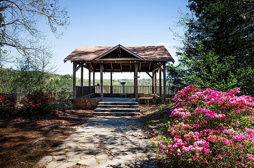 มองข้ามศาลาล้อมรอบด้วยดอกไม้สีชมพูที่ Tallulah Gorge State Park ใน Tallulah Falls รัฐจอร์เจีย