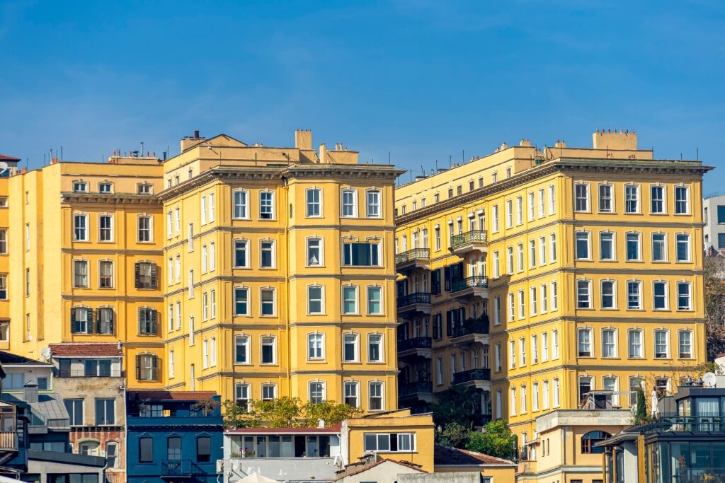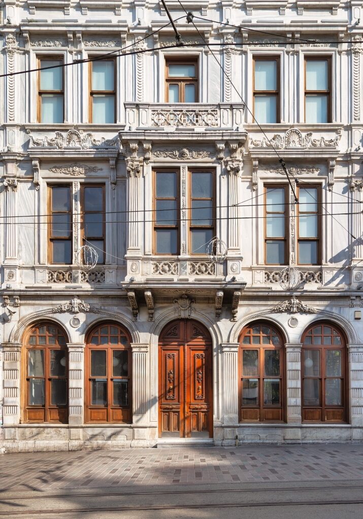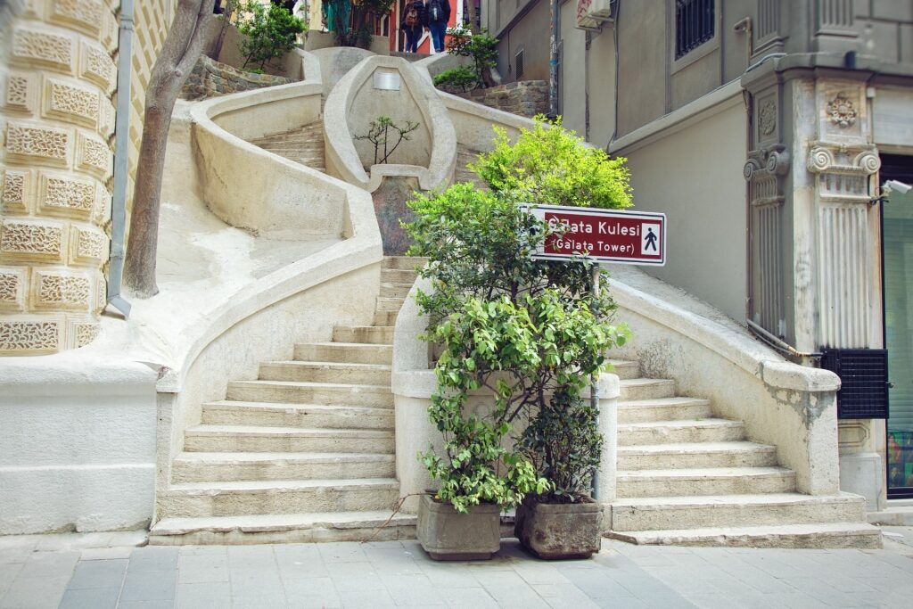ถนนปูหินแคบๆ ในเมืองกาลาตาแห่งนี้เรียงรายไปด้วยอาคารสมัยปลายศตวรรษที่ 19 และต้นศตวรรษที่ 20 ด้านหน้าอาคารที่หรูหรา ระเบียงเหล็กดัด และบานประตูหน้าต่างหลากสีสันผสมผสานสไตล์ยุโรปและตุรกี